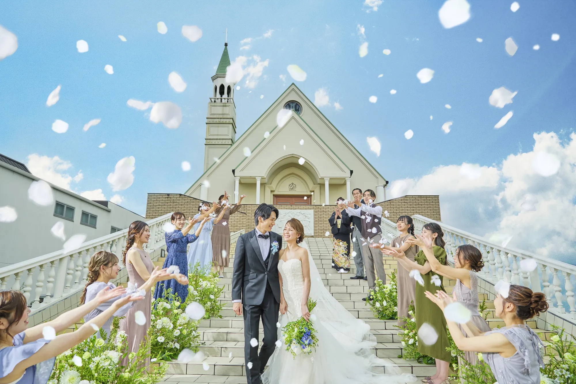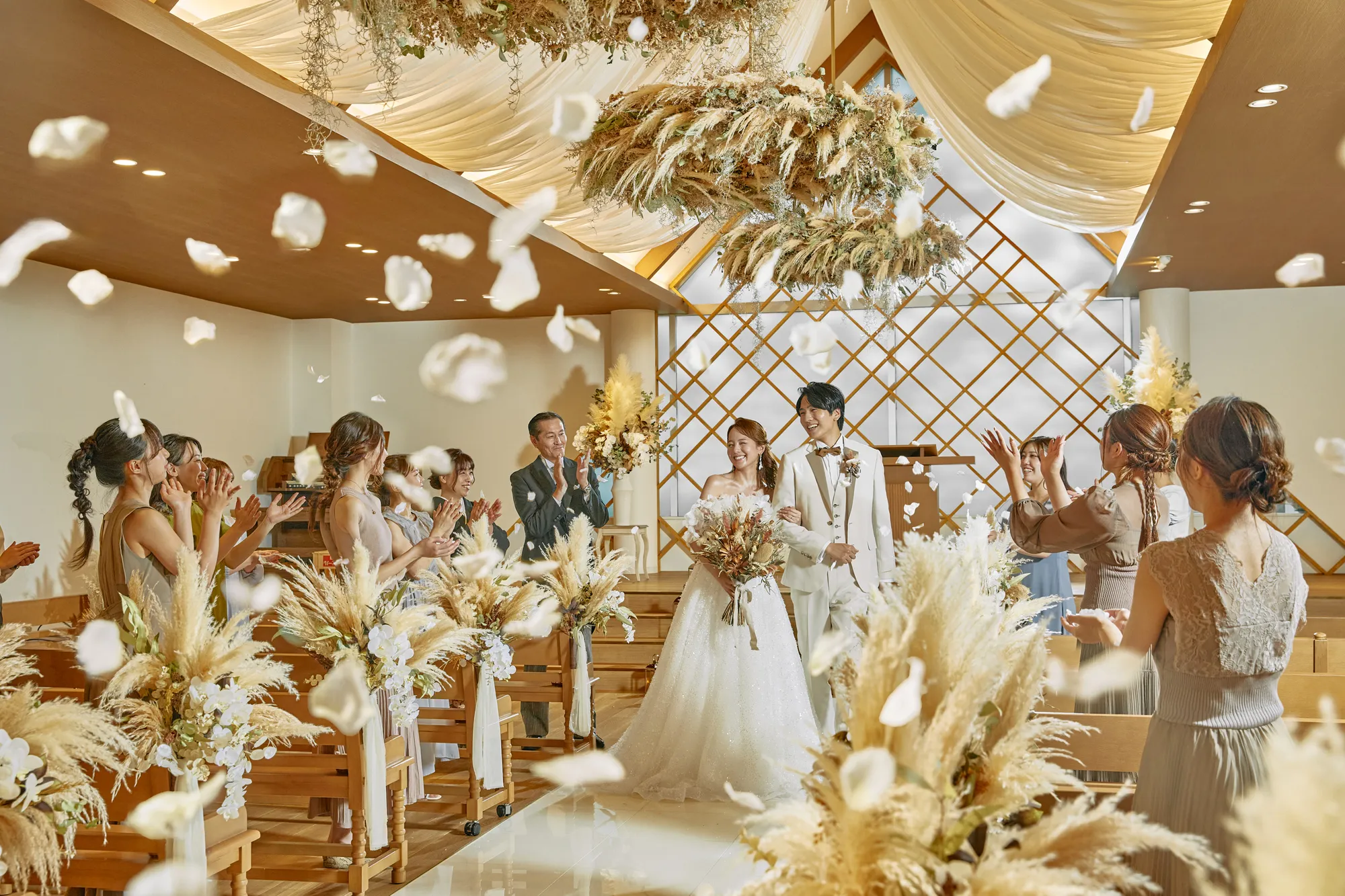 ゲストから「おめでとう」の言葉と共に舞うフラワーシャワー