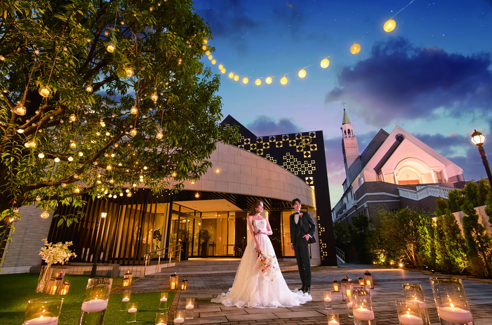 ライトアップされた幻想的な外観は星空と灯りに包まれるロマンティックな空間