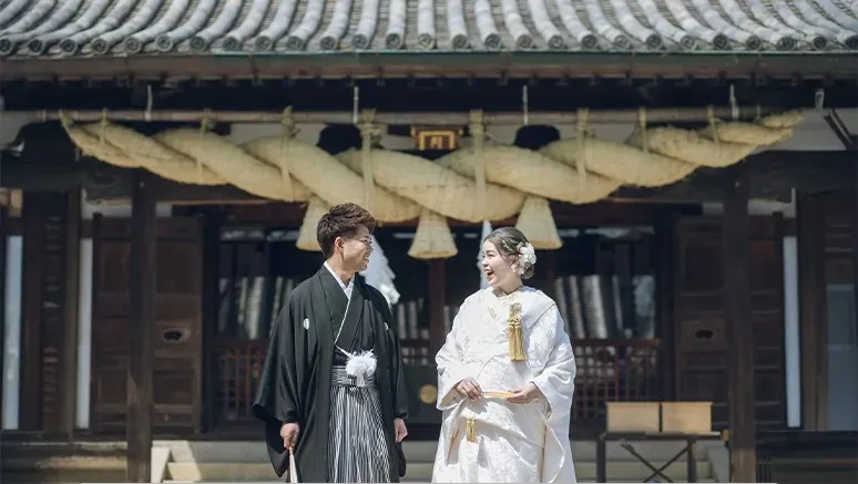 清らかな着物姿のおふたりとご両家が集い、厳かな空気が漂う神前式