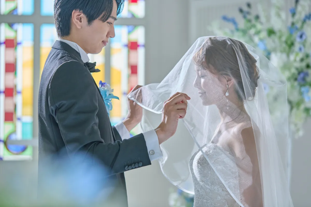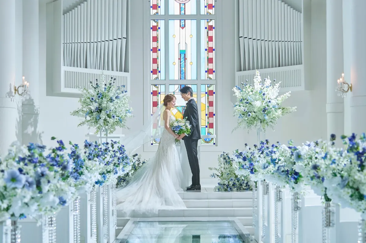 白亜に輝くステンドグラスの前で光に包まれながら誓いを交わします